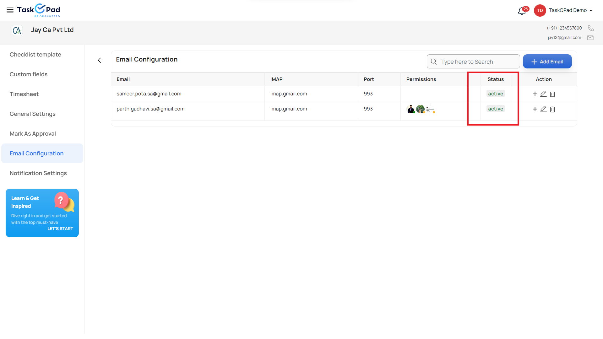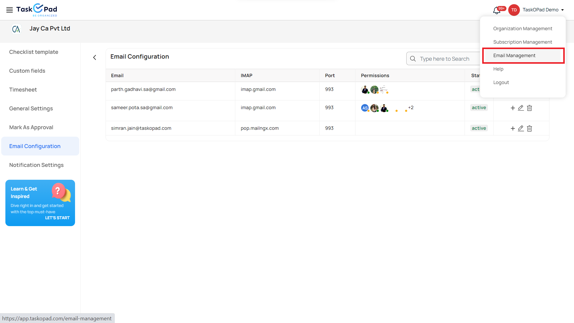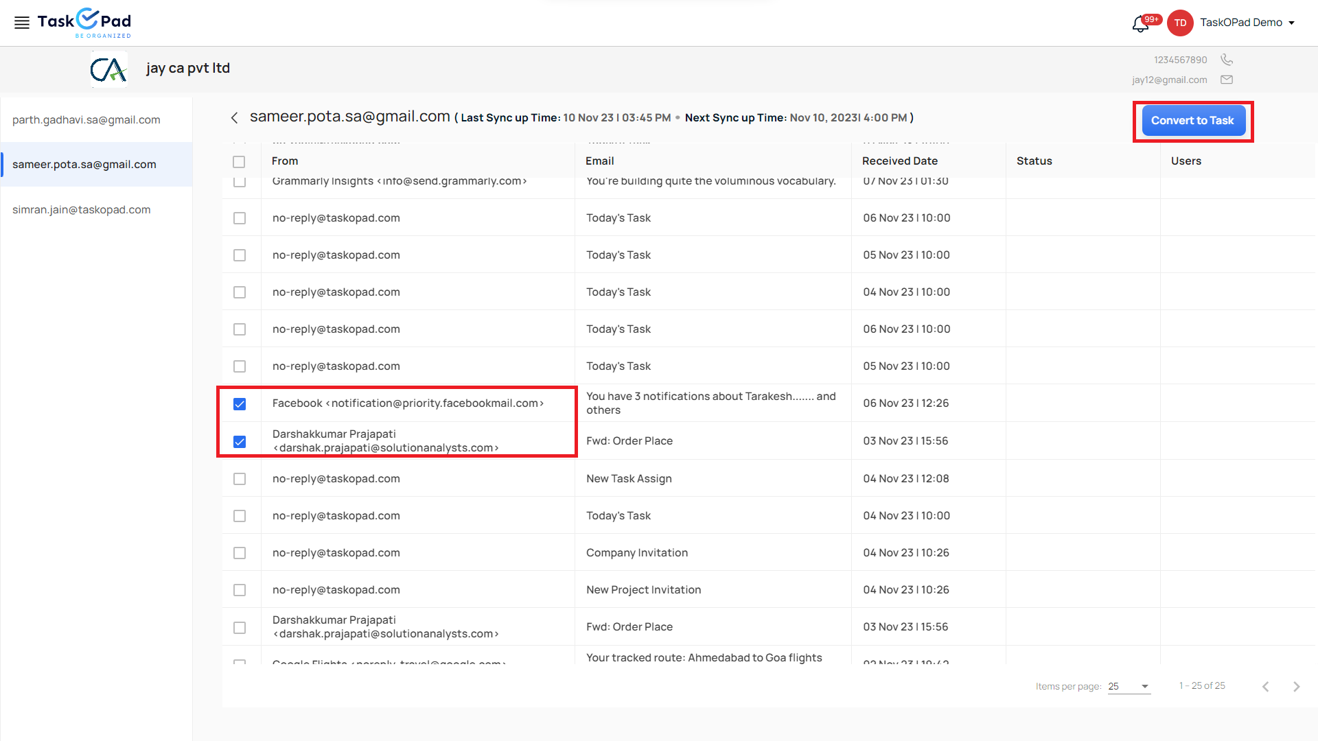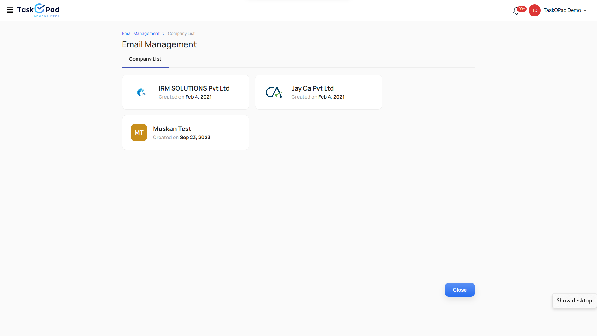 Go to **Email Management**. Select the Company in which you have integrated your emails. Your emails will be synced to TaskOPad every 15 minutes.<br>