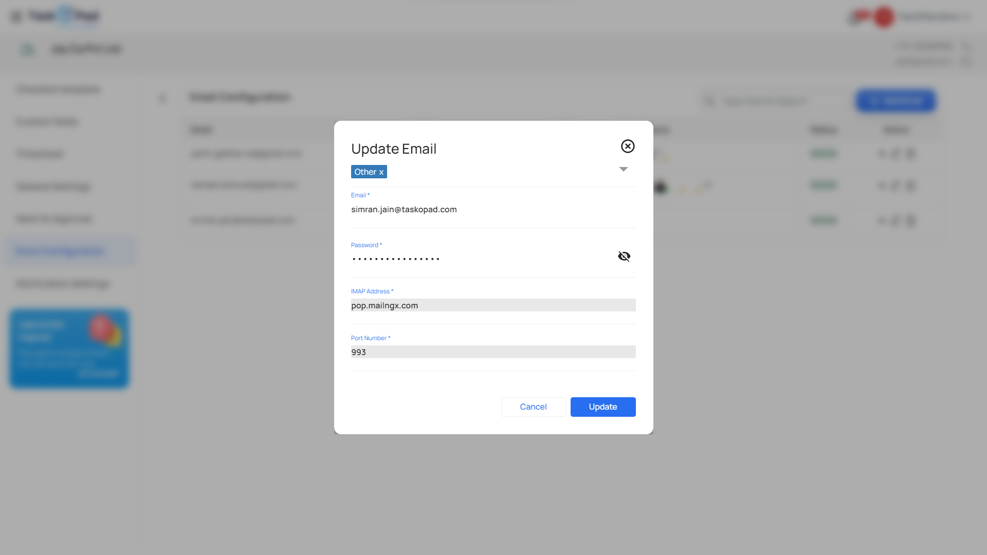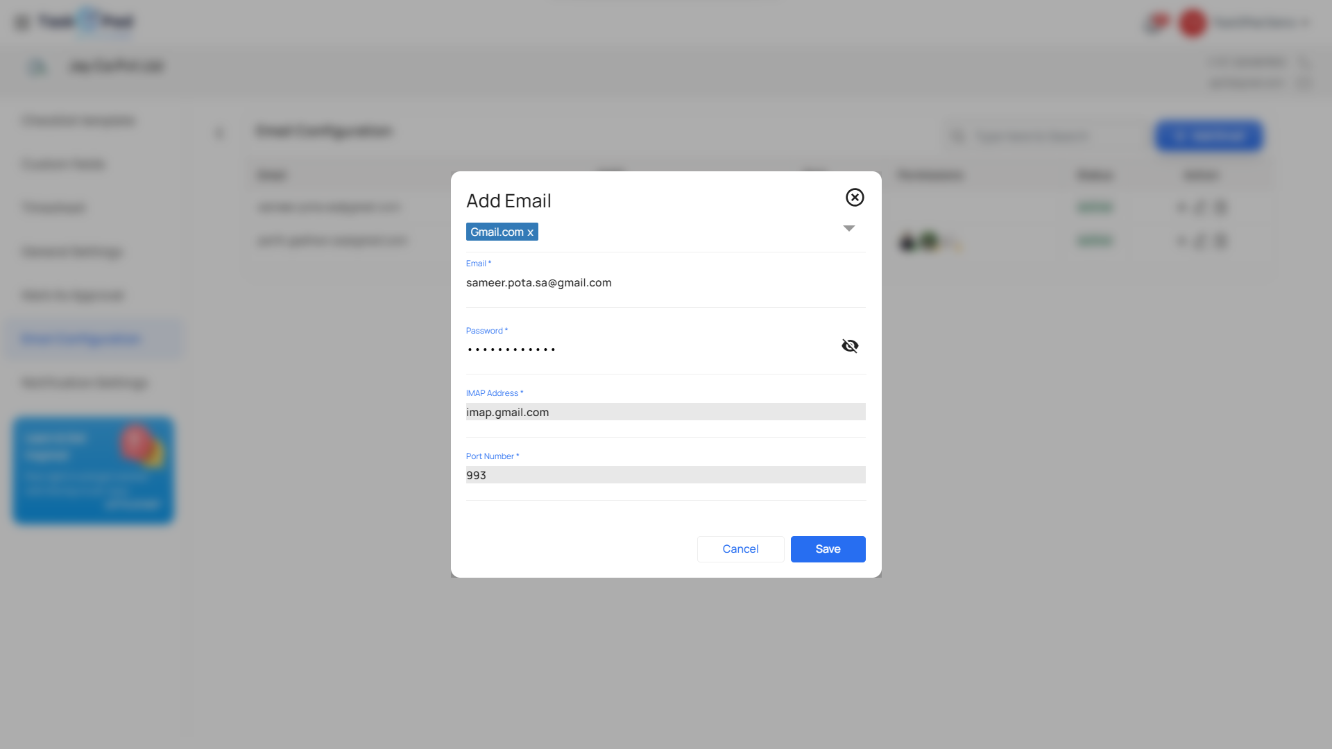 Enter the email ID and Password. Generate the IMAP Address and Port Number from your domain from the Settings menu and Enter them in TaskOPad and Your account will be integrated.