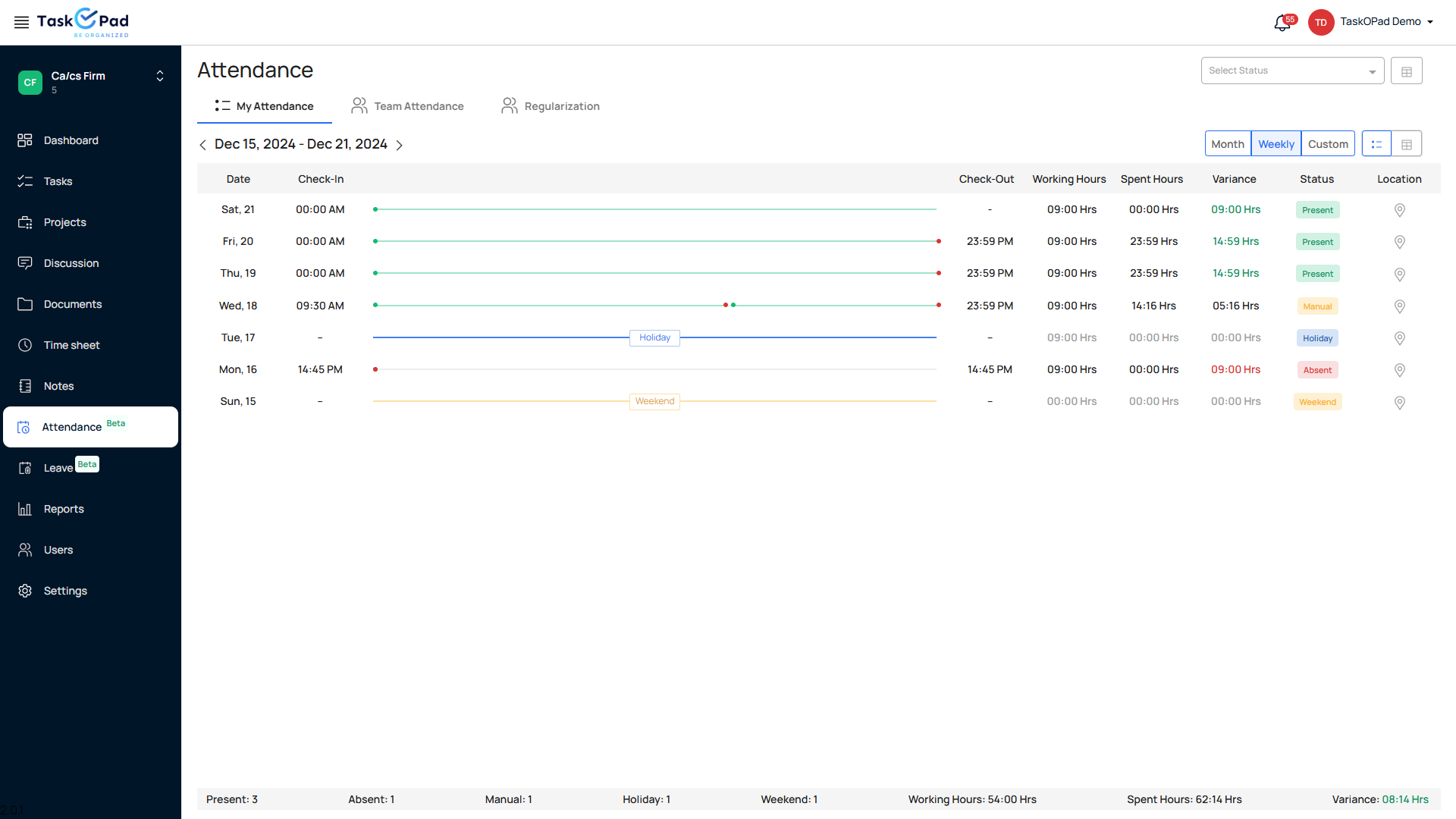 This allows you to filter the status, for example, if you want to view your total present, absent, holiday, and weekend status.