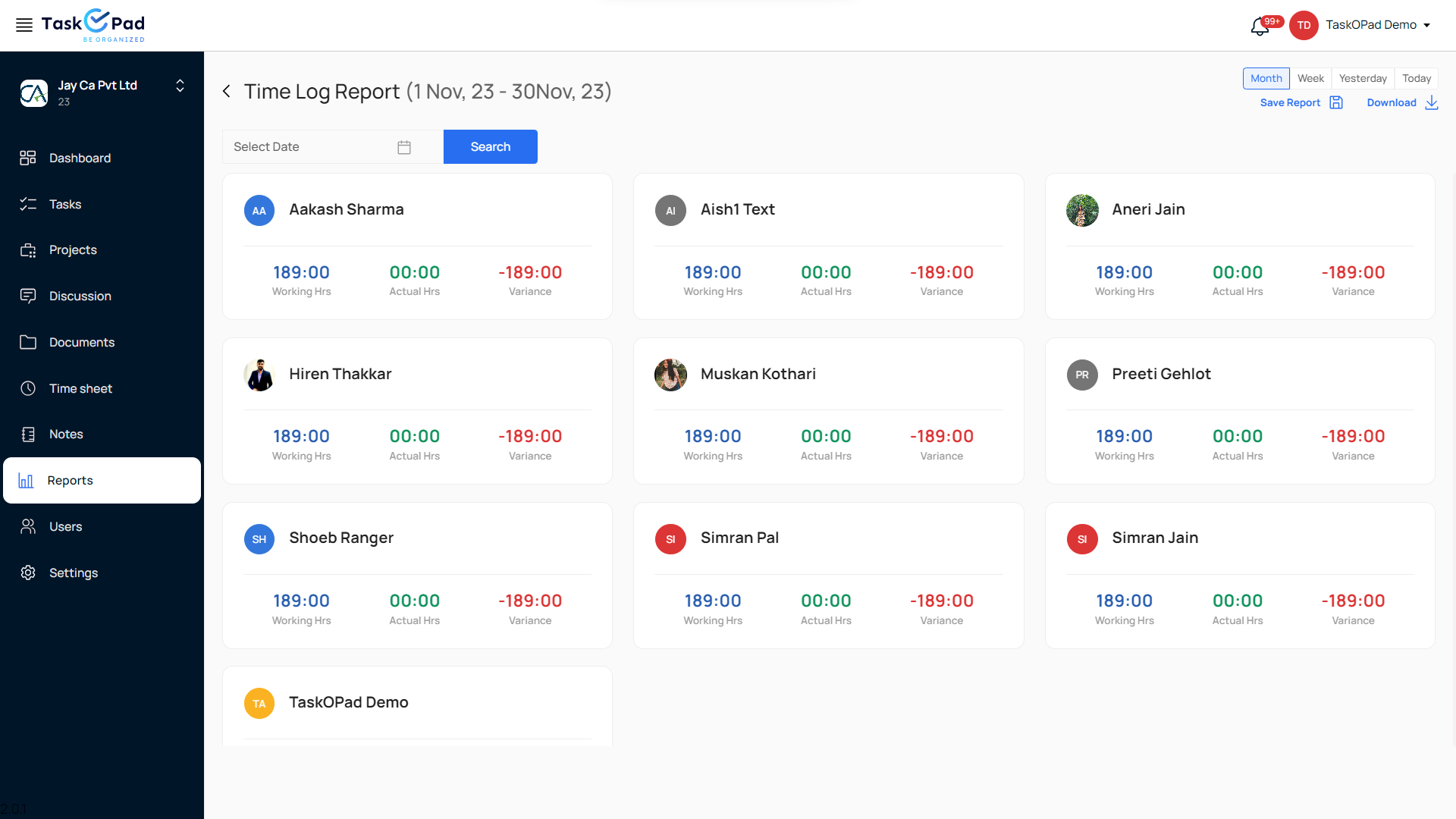 Time tracking is the process of monitoring and recording how a Team can spend time on different tasks and projects. It allows you to identify where your team spends time, and how it can used more effectively to achieve individual goals. So, the Time Report will give you the performance report of each team member with their time variance. From these reports, you can calculate whether the team member has spent Working Hours or spent extra on Monthly weekly, or any other Frequency.