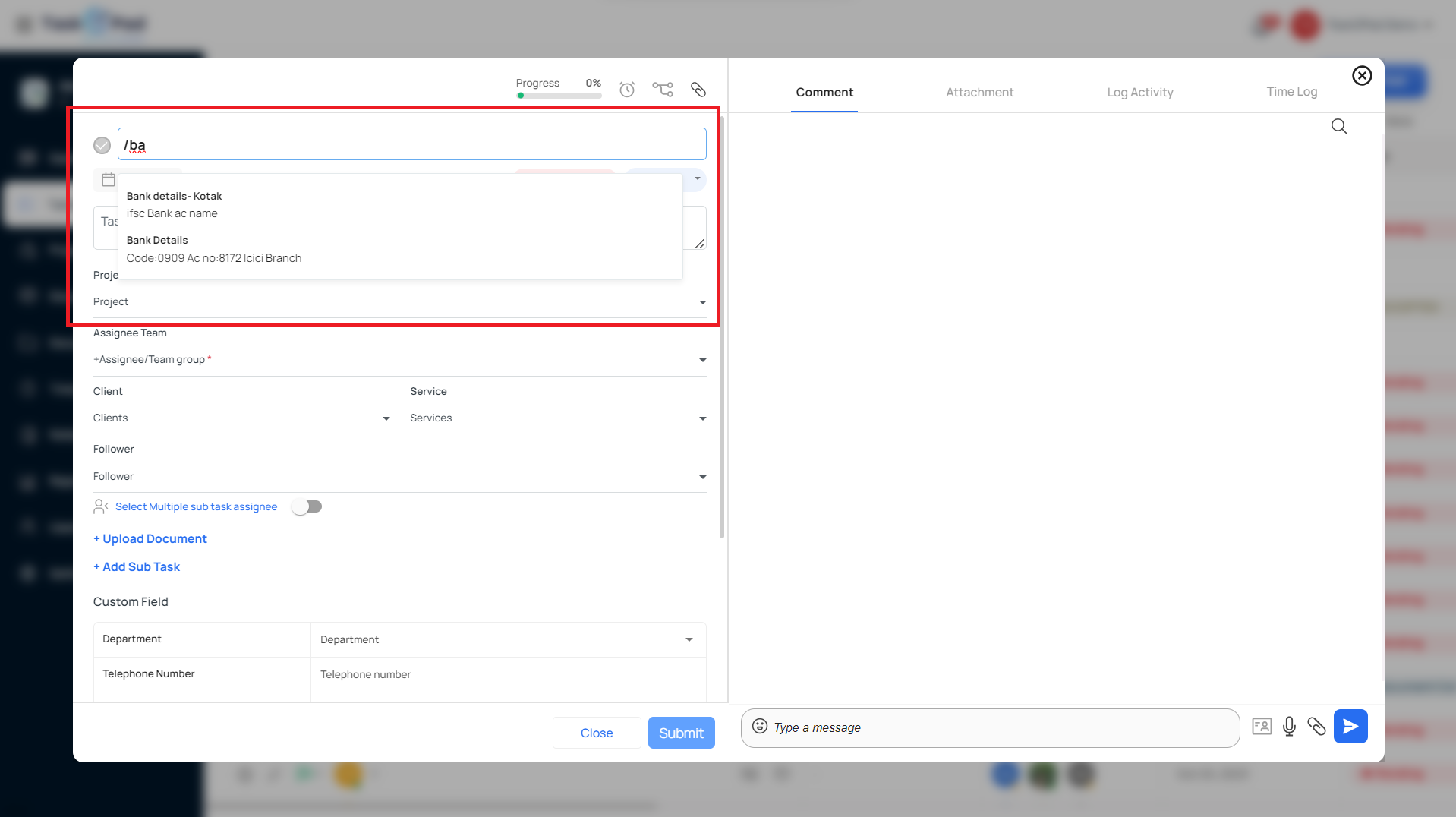 To save time while sending a brief message, use the / symbol in the Task, Task Description, and Text section.
