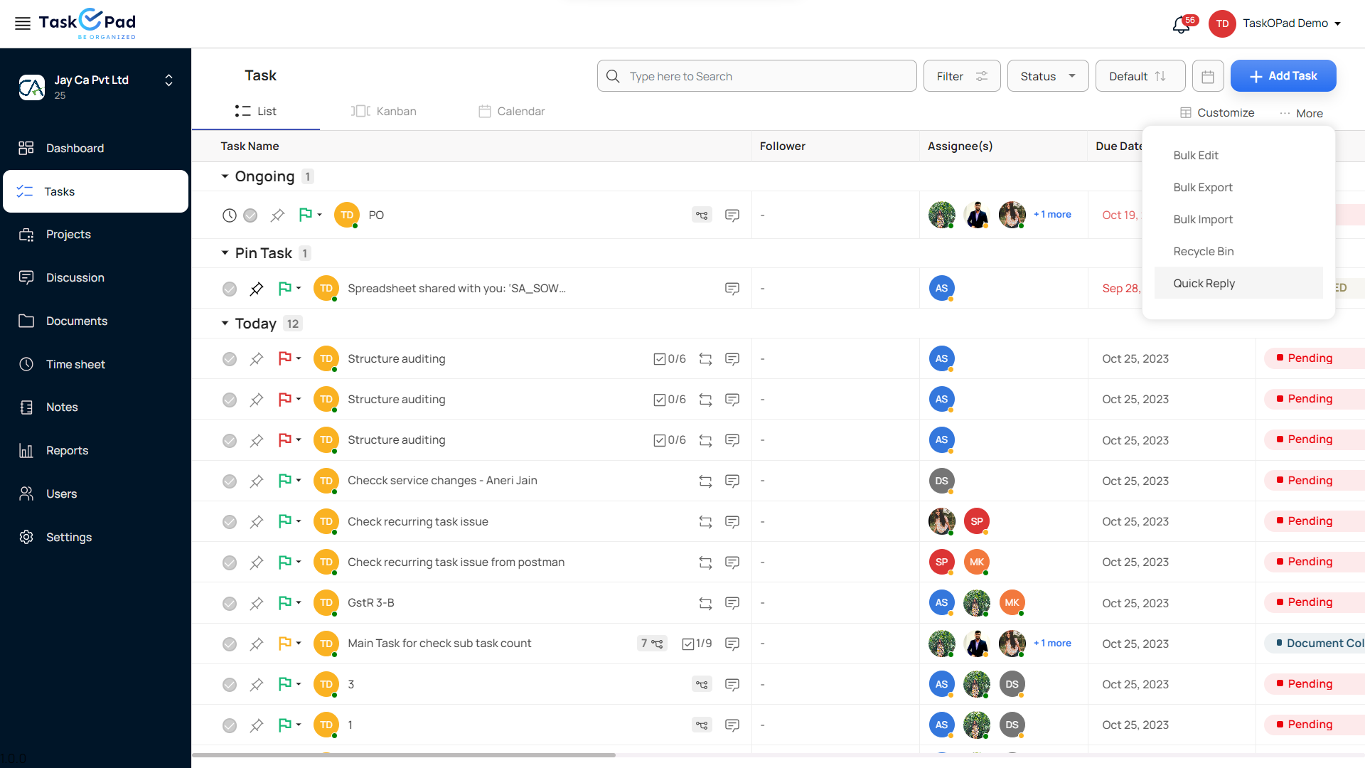 ***Quick Reply:*** TaskOPad Introduce quick reply which is a predefined message that you can quickly select, edit, and send to the Team. You’ll save time by responding quickly. It’s also possible to create shortcuts for quick replies with this feature. Users can simply write ‘/’ in a conversation after selecting the message to send from the listing, accordingly, they can post into the comment section, Task name, and everywhere in the Text area.