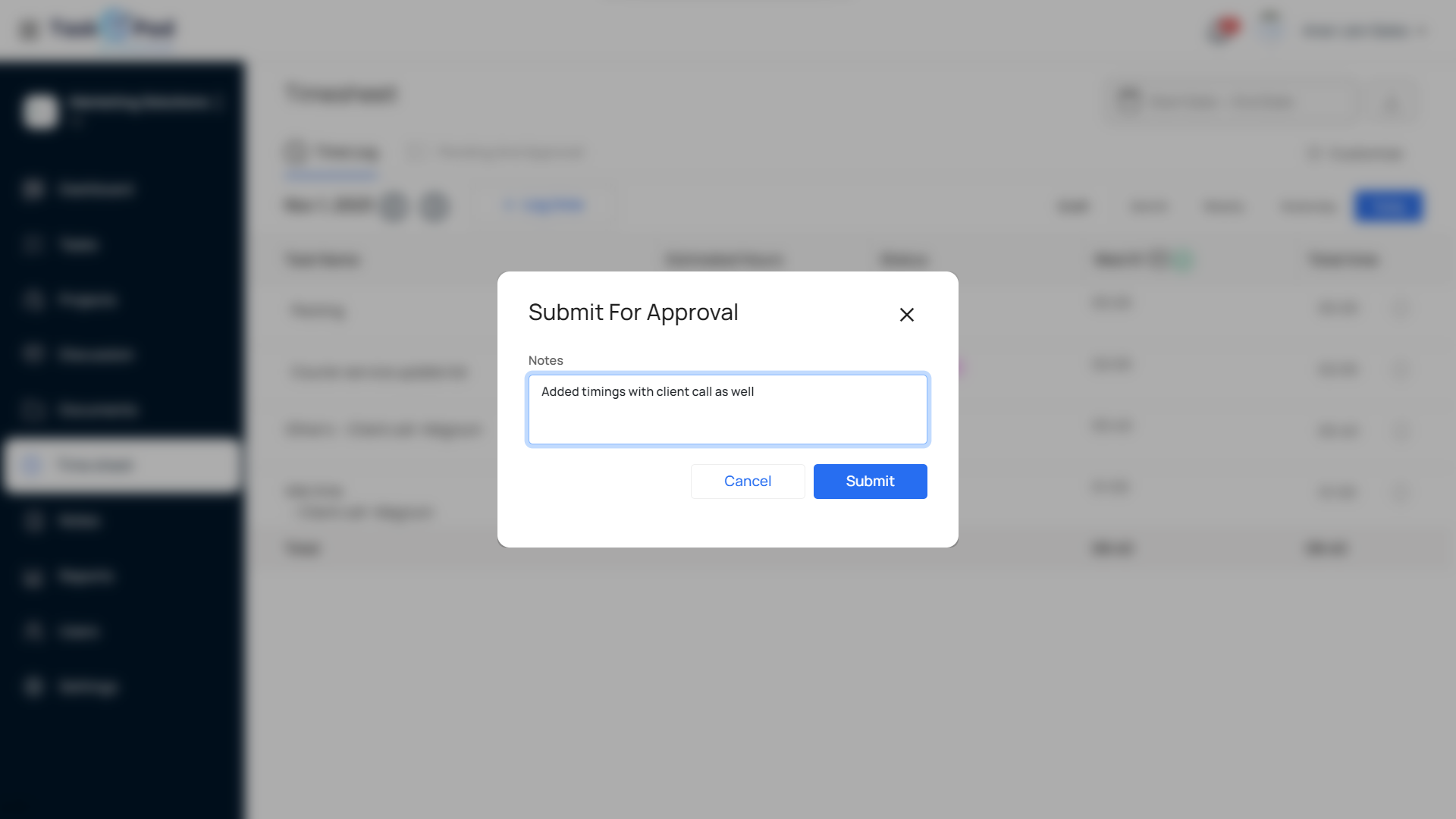 While Submitting the Timesheet you will have the option to mention the notes or any information to your superior. The below image will show the Notes kept while submitting the timesheet.