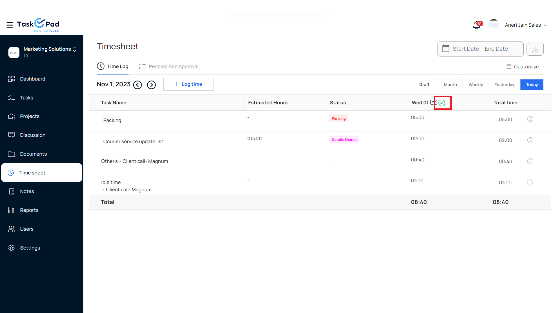 ***How to Submit Timesheet:*** By the end of the day, Team members can submit daily timesheets to the superior by clicking on the <mark style="color:green;">**Green Button**</mark>**.** Timesheets should be submitted for approval or rejection.&#x20;