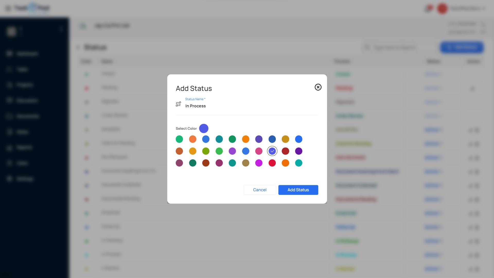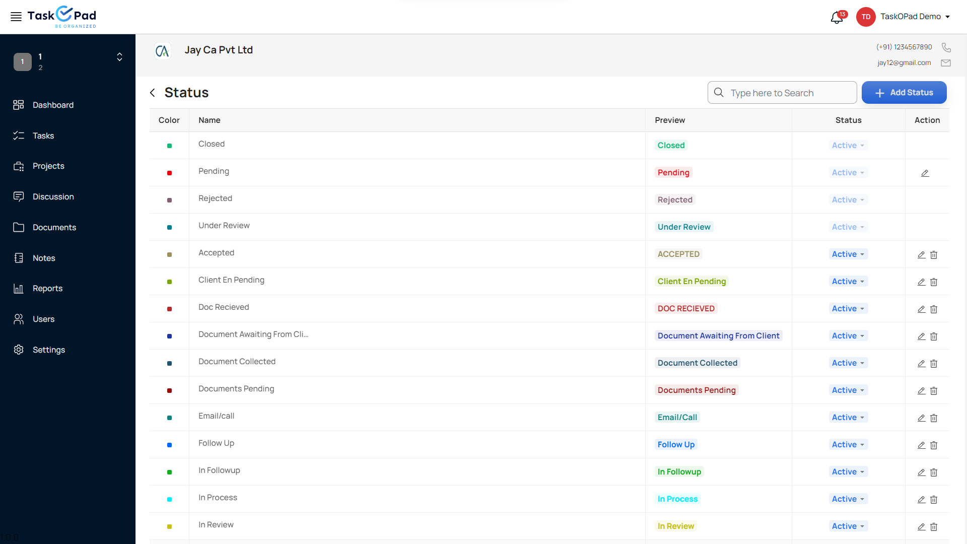 ***Status Creation:*** Click on “Add New Status” to add statuses.&#x20;